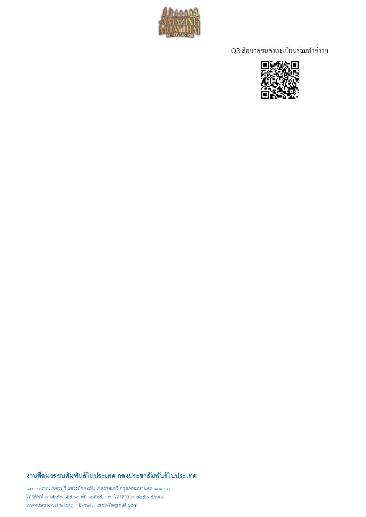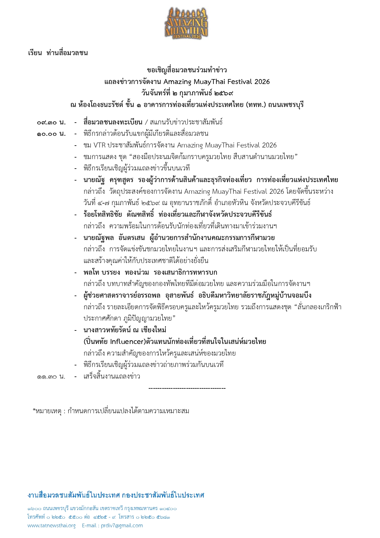 ขอเชิญสื่อมวลชนร่วมทำข่าวแถลงข่าวการจัดงาน Amazing MuayThai Festival 2026 วันจันทร์ที่ 2 ก.พ. 2569 เวลา 09.30 น. ณ ห้องโถงธนะรัชต์ ชั้น 1 อาคาร ททท.