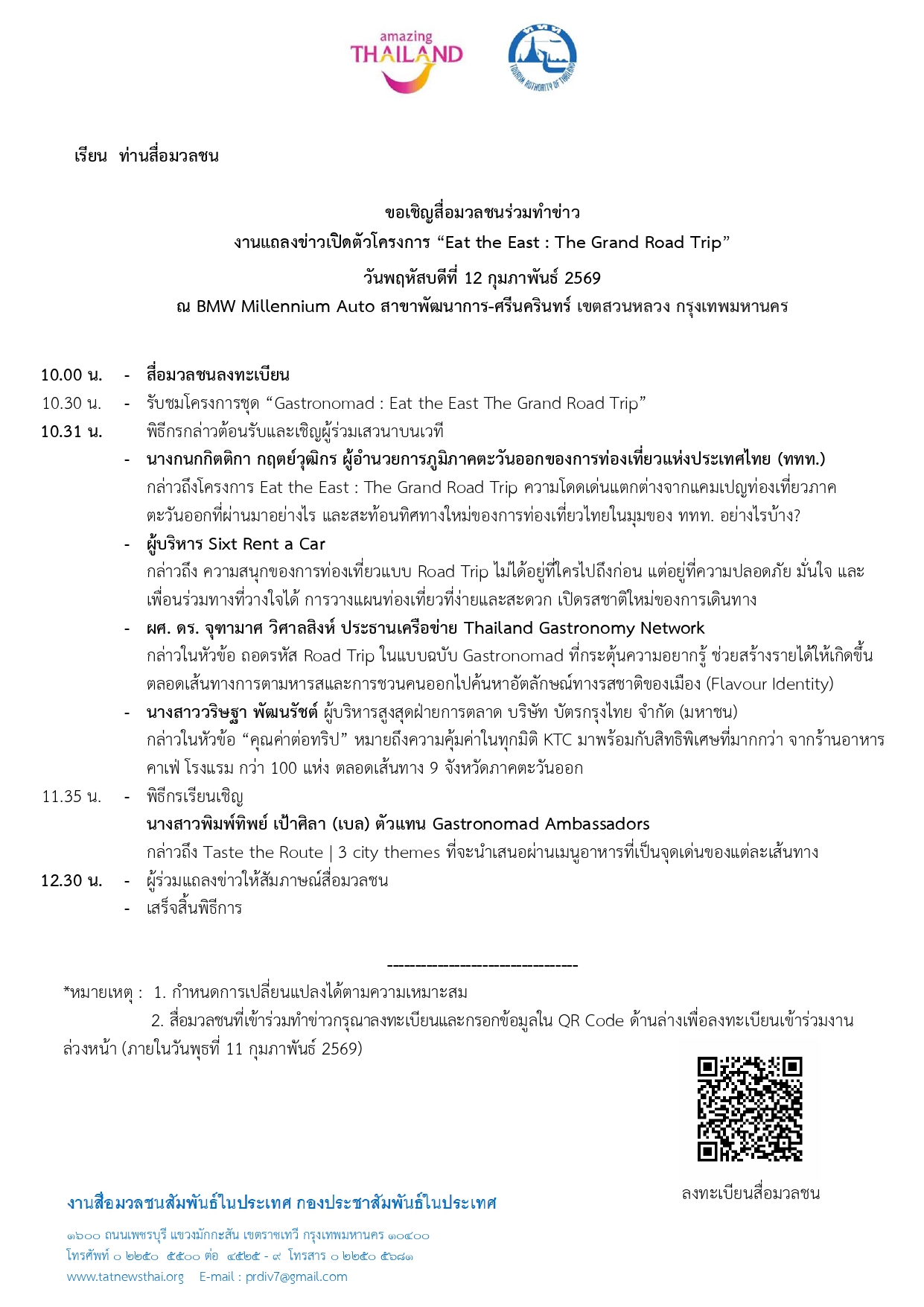 ขอเชิญสื่อมวลชนร่วมงานวันคล้ายวันสถาปนา ททท. ครบ 66 ปี วันพุธที่ 18 มี.ค.2569 เวลา 08.15 น. ณ อาคาร ททท. ถนนเพชรบุรี