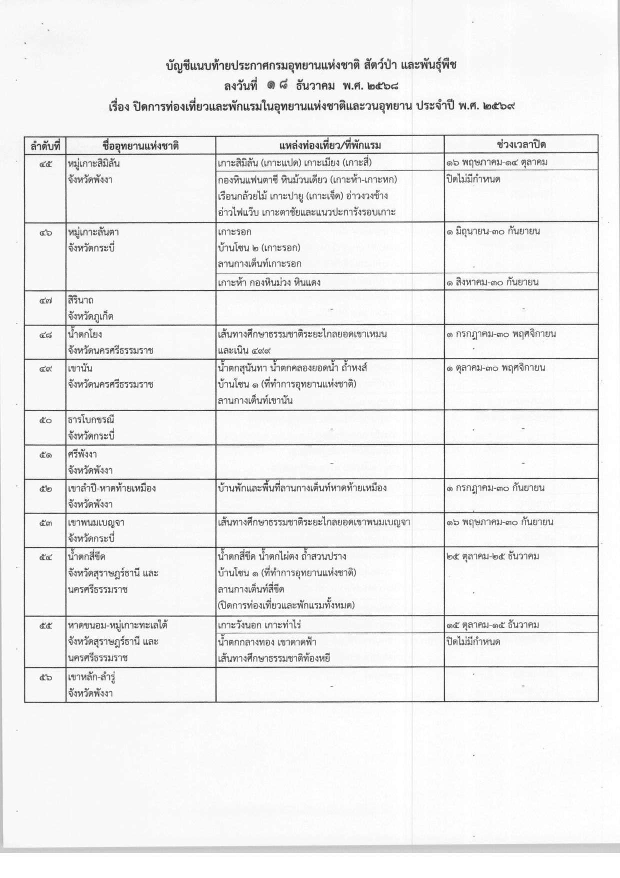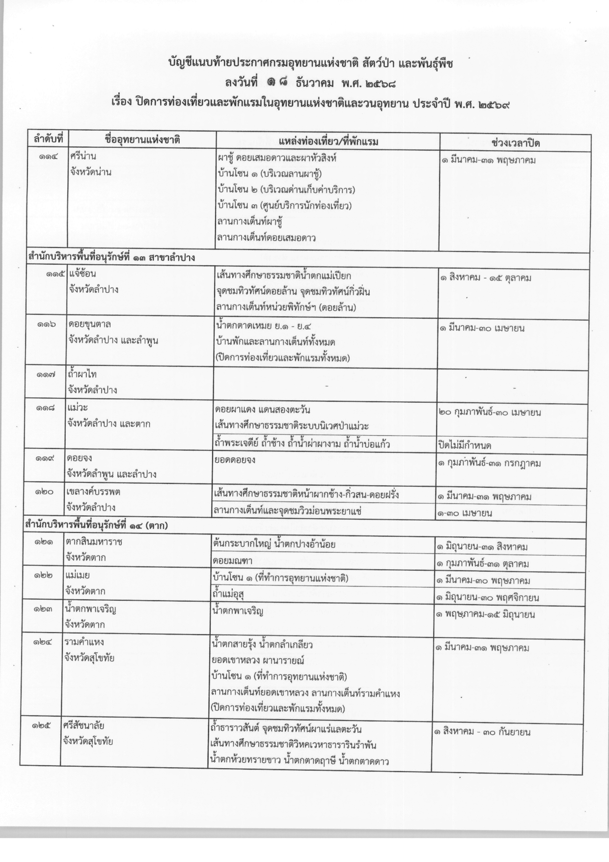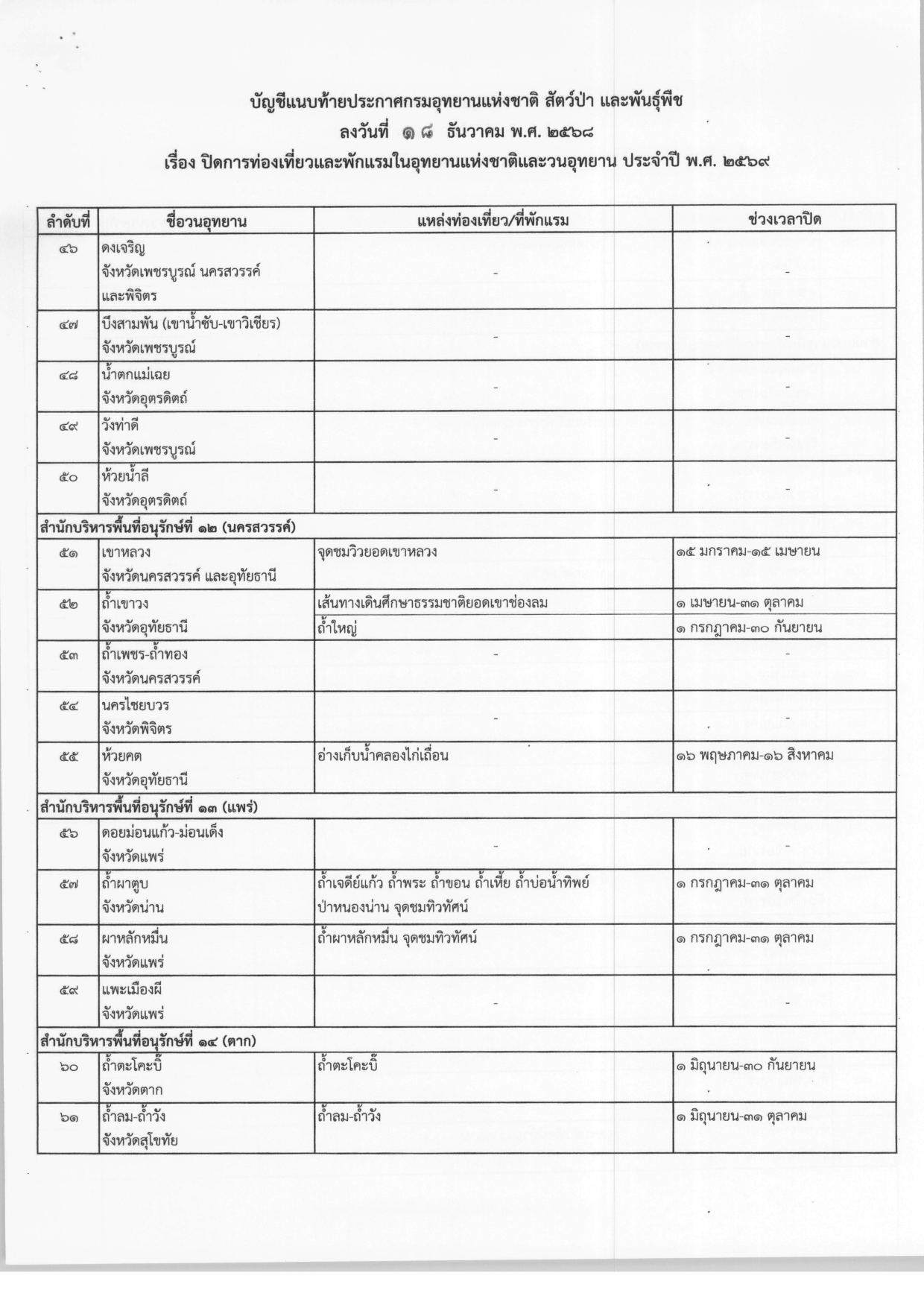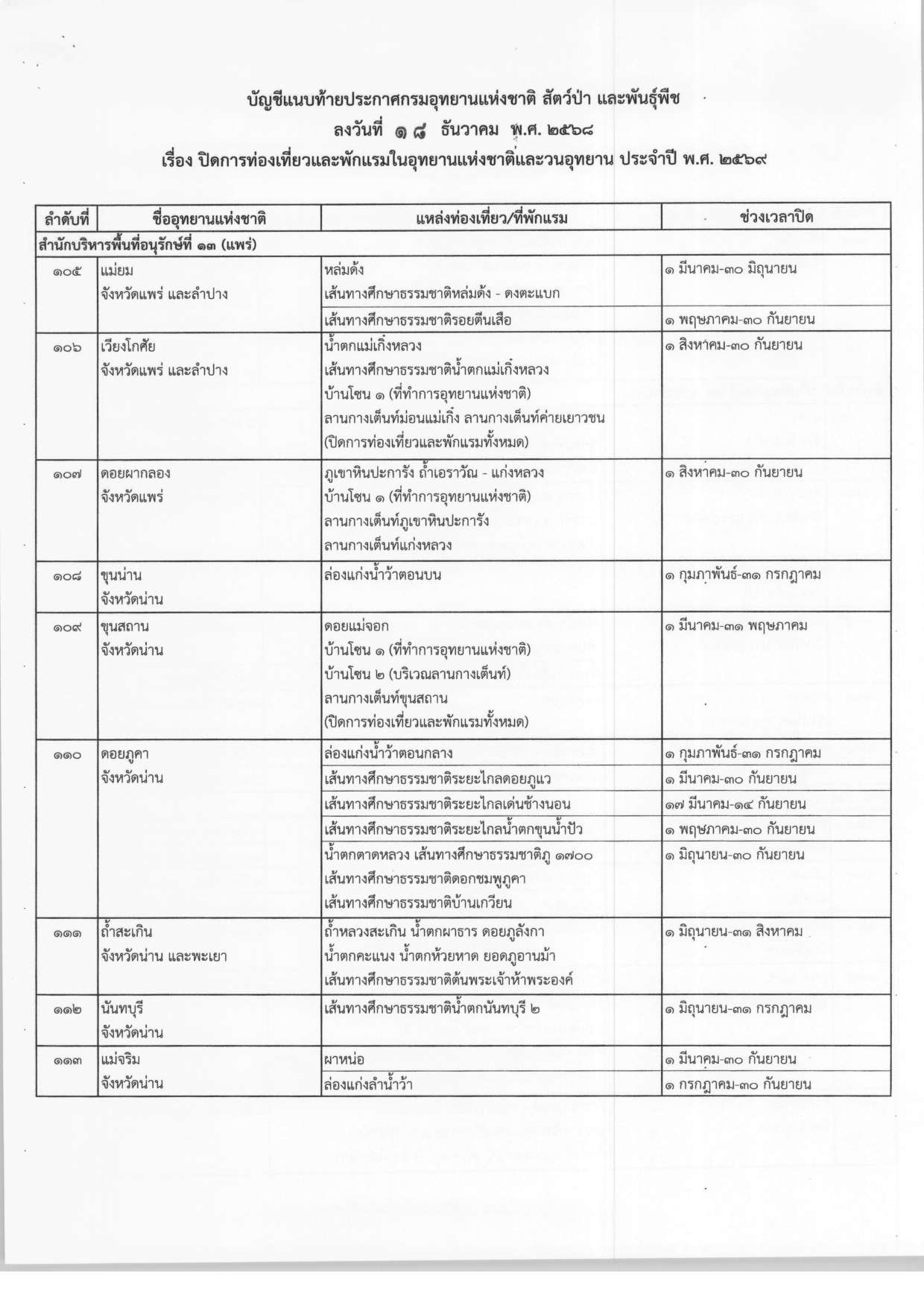 ประกาศปิดการท่องเที่ยวและพักแรมในอุทยานแห่งชาติและวนอุทยาน ประจำปี พ.ศ.2569 จากกรมอุทยานแห่งชาติ สัตว์ป่า และพันธุ์พืช