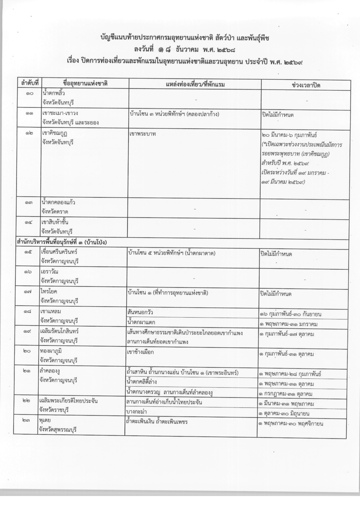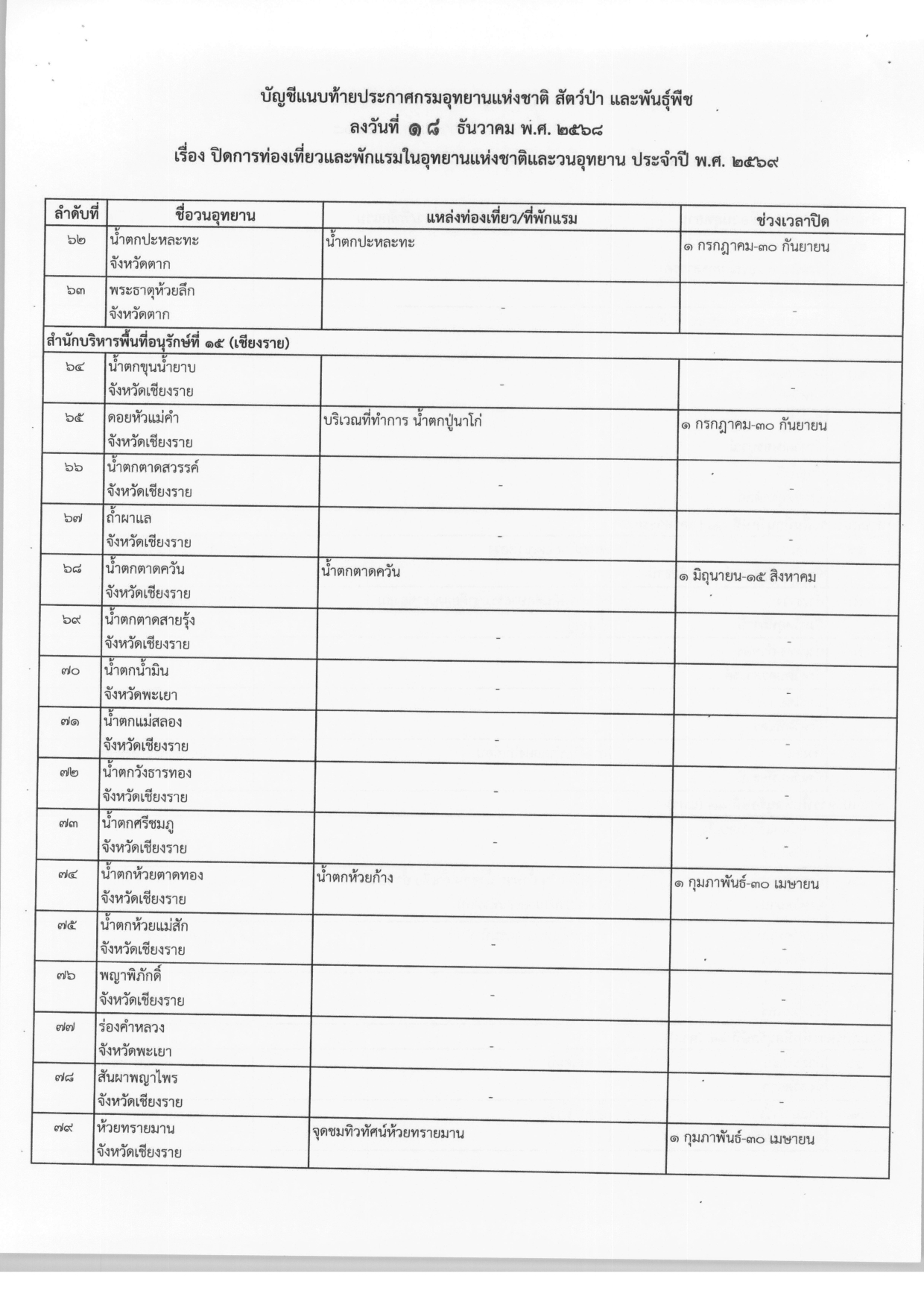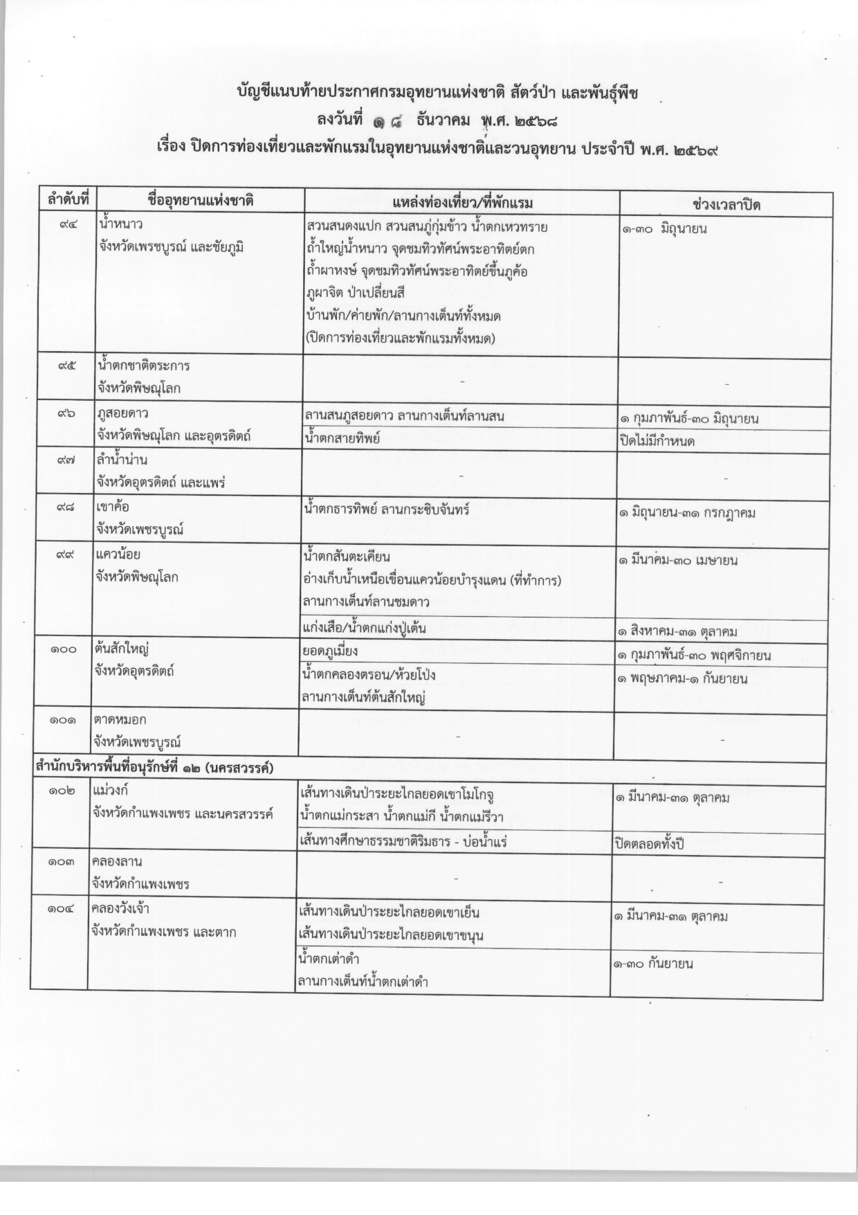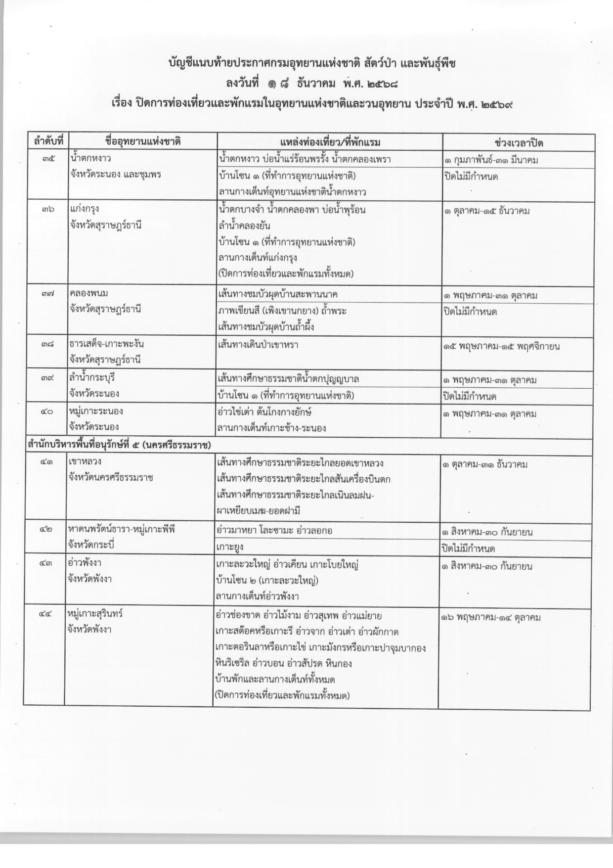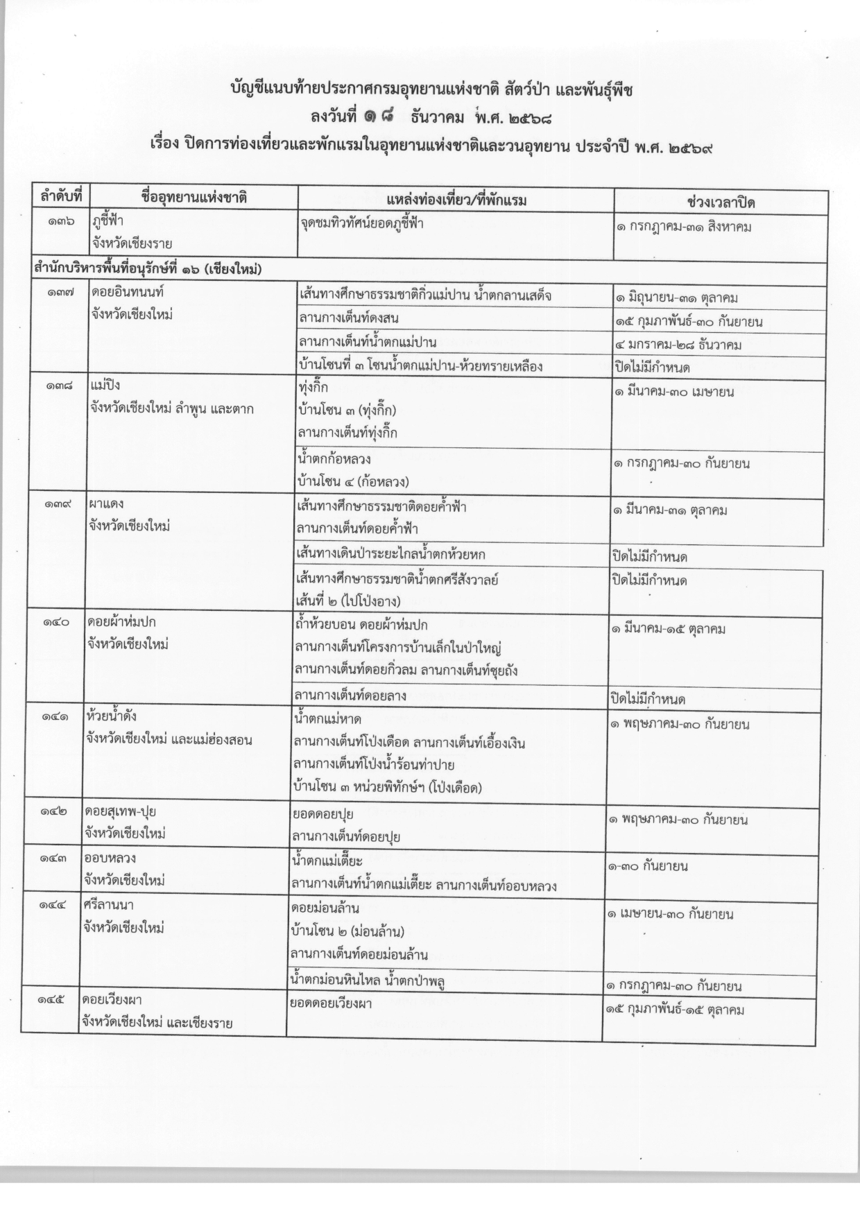 ประกาศปิดการท่องเที่ยวและพักแรมในอุทยานแห่งชาติและวนอุทยาน ประจำปี พ.ศ.2569 จากกรมอุทยานแห่งชาติ สัตว์ป่า และพันธุ์พืช