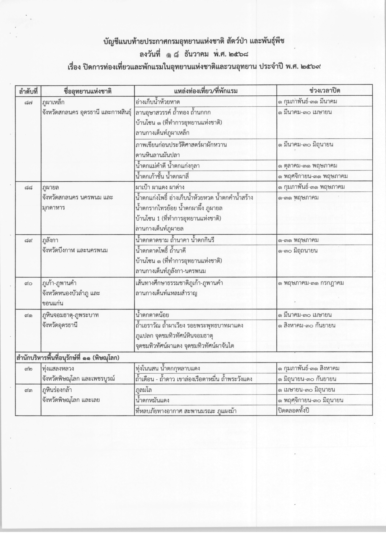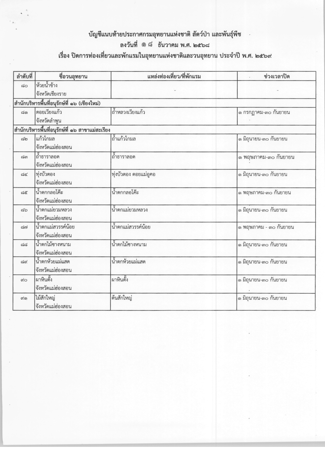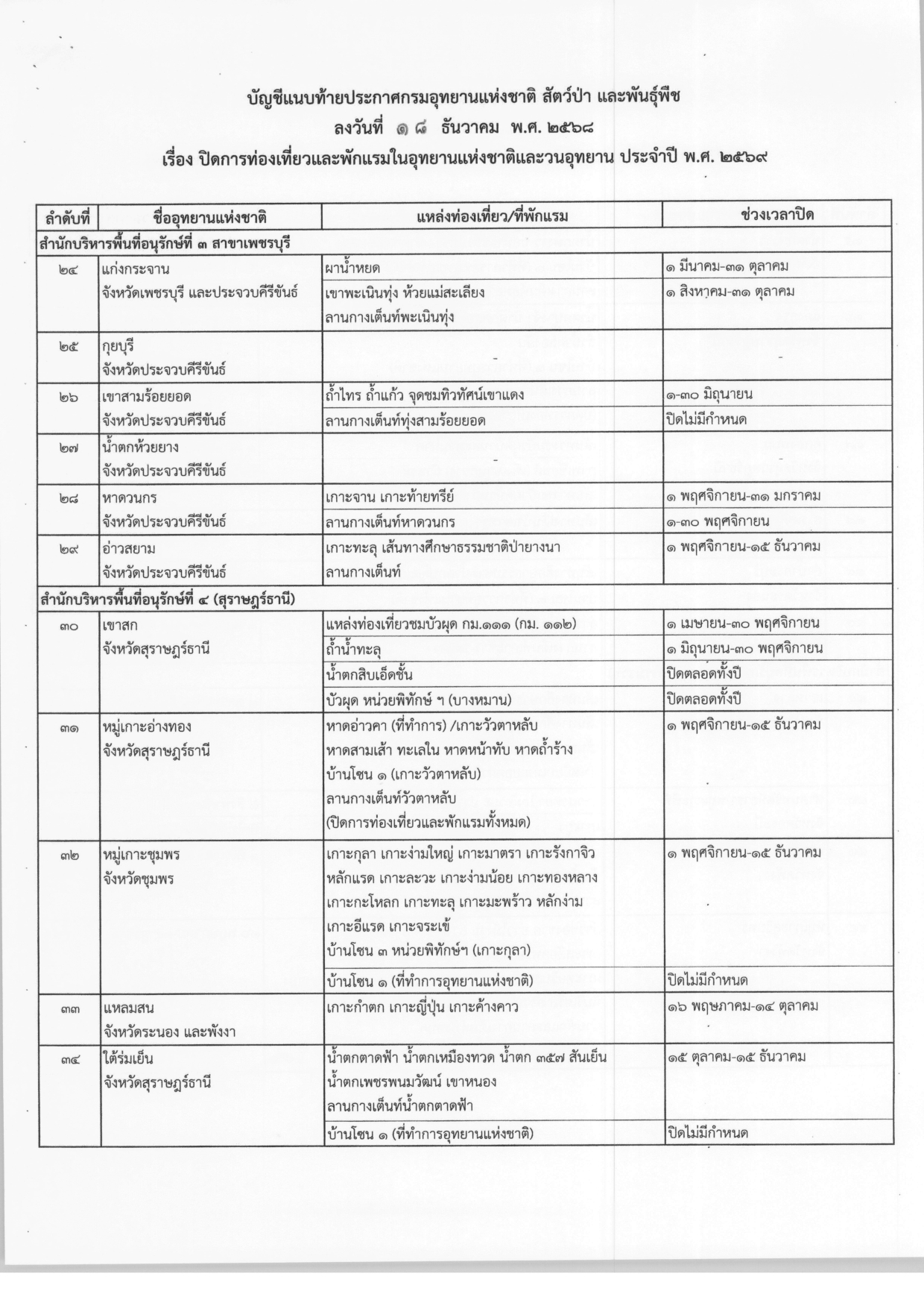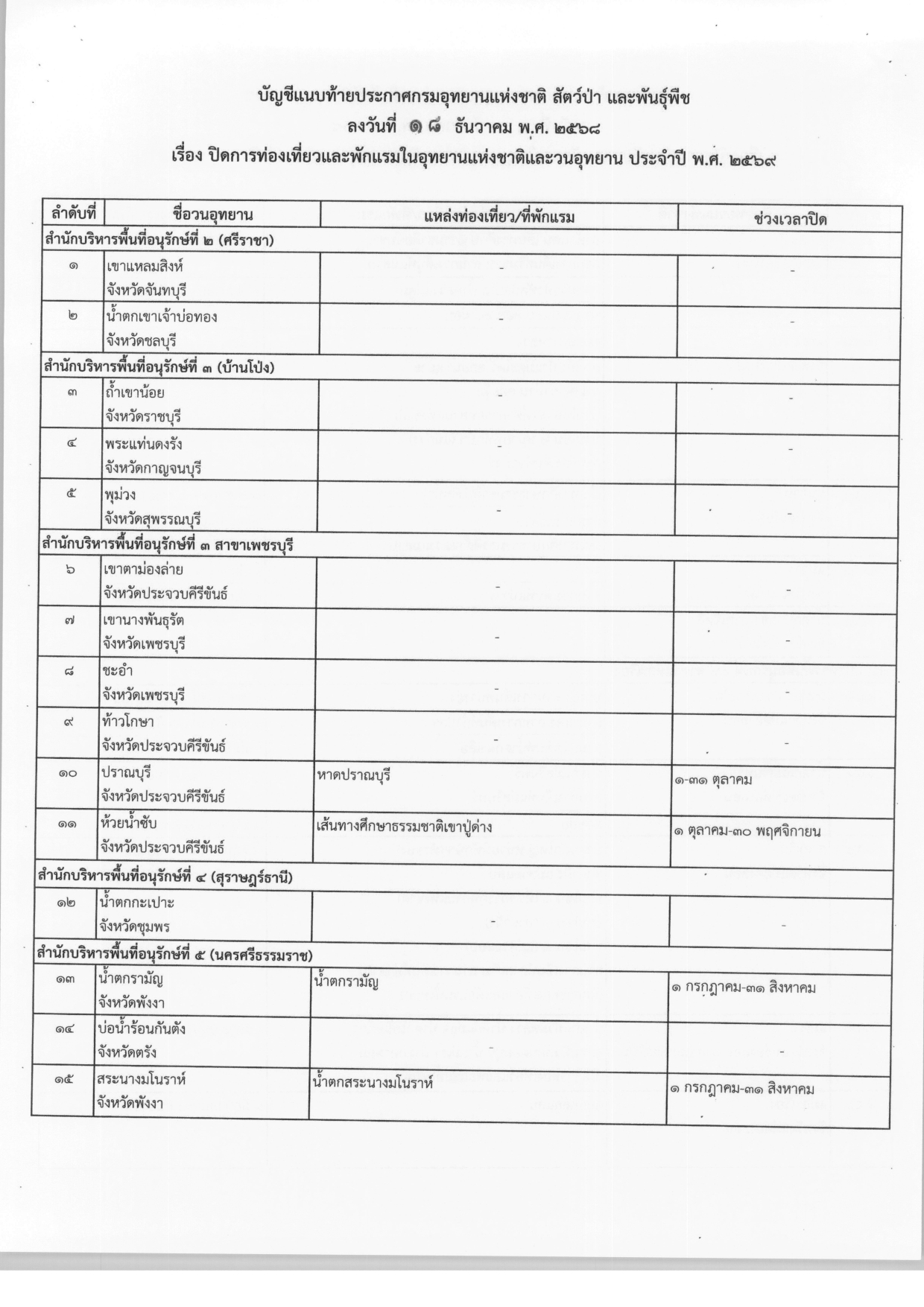 ประกาศปิดการท่องเที่ยวและพักแรมในอุทยานแห่งชาติและวนอุทยาน ประจำปี พ.ศ.2569 จากกรมอุทยานแห่งชาติ สัตว์ป่า และพันธุ์พืช