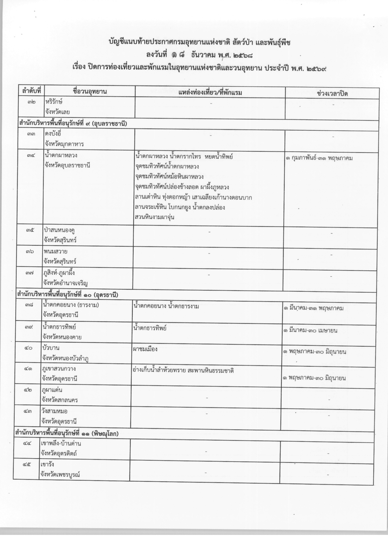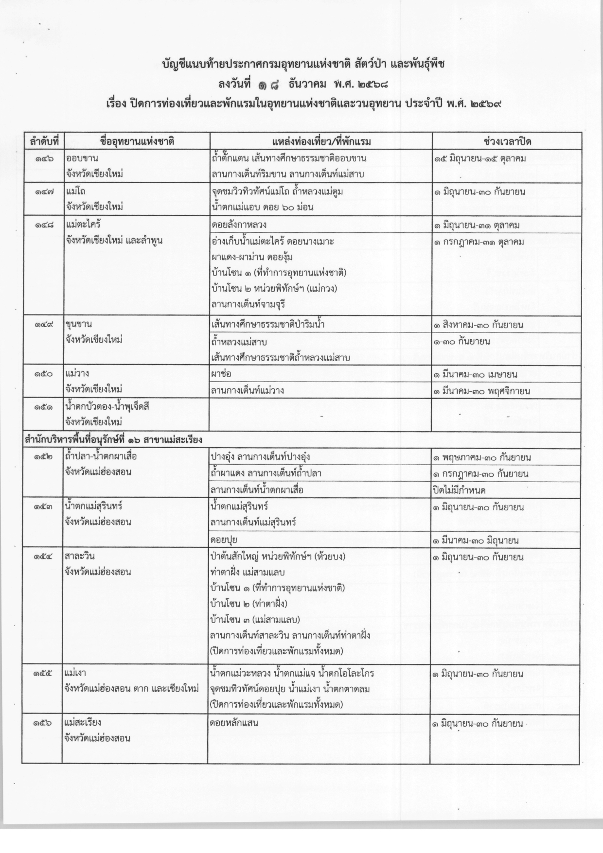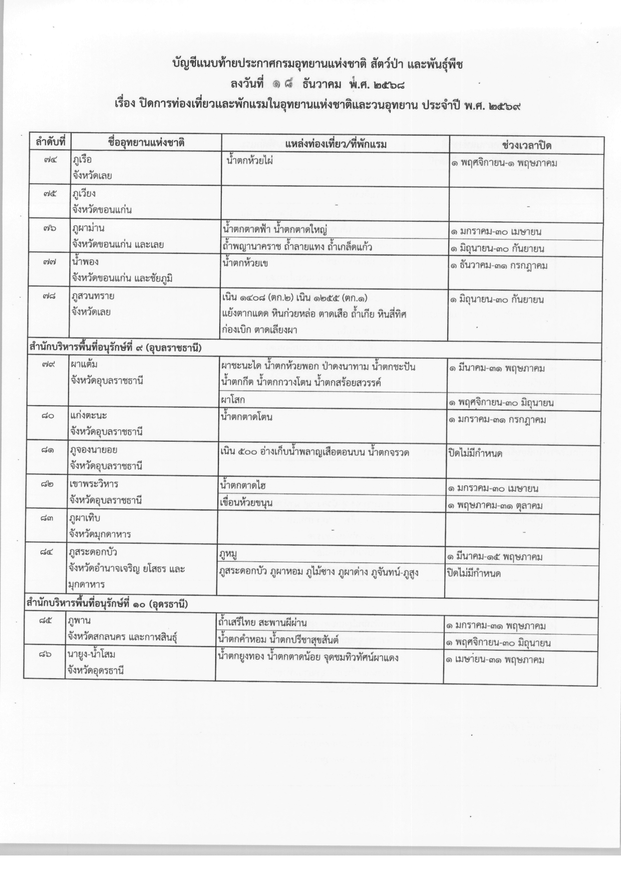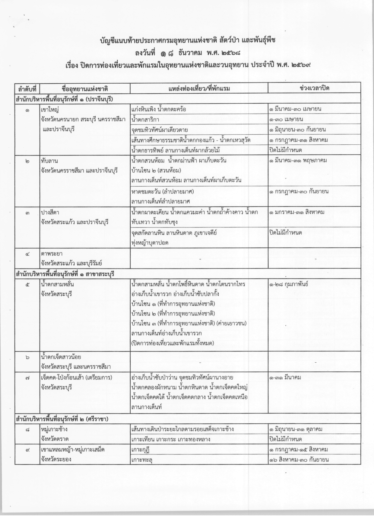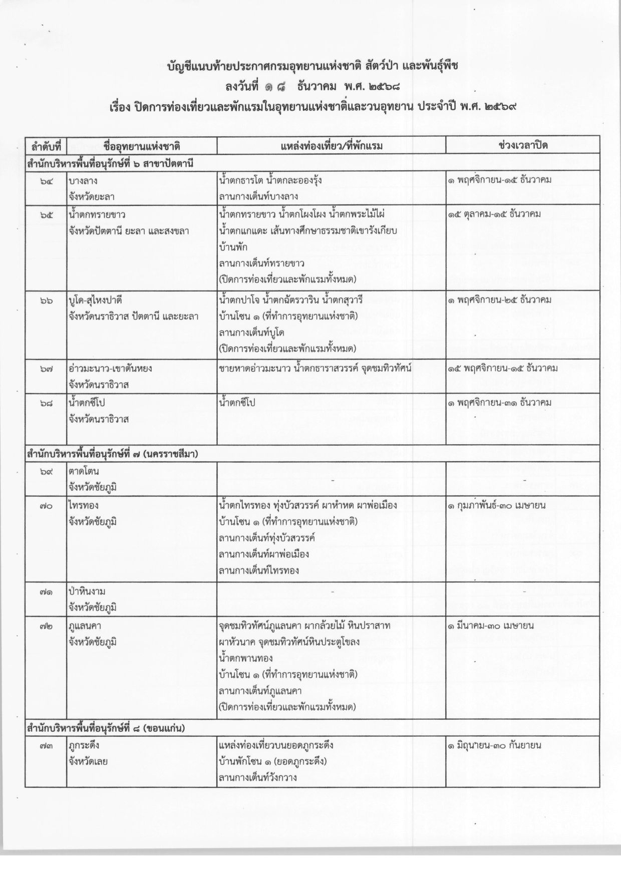 ประกาศปิดการท่องเที่ยวและพักแรมในอุทยานแห่งชาติและวนอุทยาน ประจำปี พ.ศ.2569 จากกรมอุทยานแห่งชาติ สัตว์ป่า และพันธุ์พืช